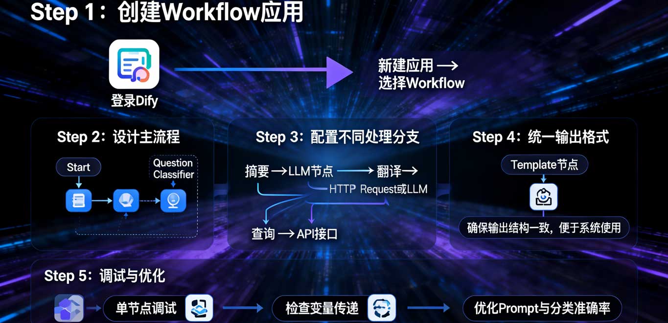 本文系统讲解 Dify 工作流的核心概念、操作方法与实际应用场景,面向零基础或初级 AI 开发者。文章介绍了 AI 工作流、Prompt、LLM、大语言模型节点、Question Classifier、HTTP Request 接口调用节点和模板节点等核心名词,结合内容审核、客服和多语言翻译场景进行现实案例解析。通过详细步骤指导,读者可以在 Dify 平台上创建完整工作流,实现多任务分支处理、调用外部系统和统一输出格式。文章还提供通用模板和落地案例,强调工作流是 AI 从“能想”到“能做”的关键工程化方法,为团队构建长期可维护的 AI 应用提供实践指南。